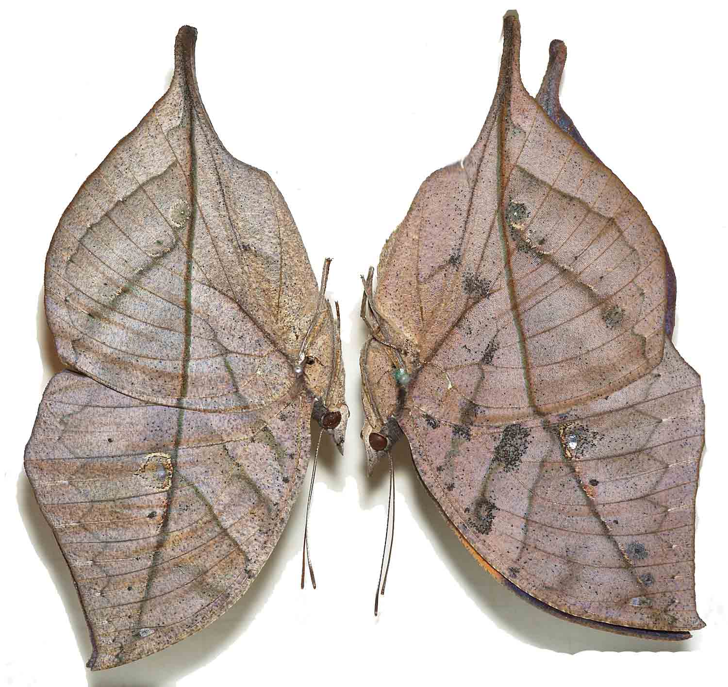 Kallima inachus chinensis wingspan cm 4-4.5 Tropical Insect Brush-Footed or Four-Footed Butterfly Nymphalidae. Common name: Indian Orange Oakleaf or Dead Leaf Butterfly. With wings closed, this spectacular butterfly looks like a dry leaf, including the veins, and it is a typical and splendid example of camouflage (cryptic mimicry).