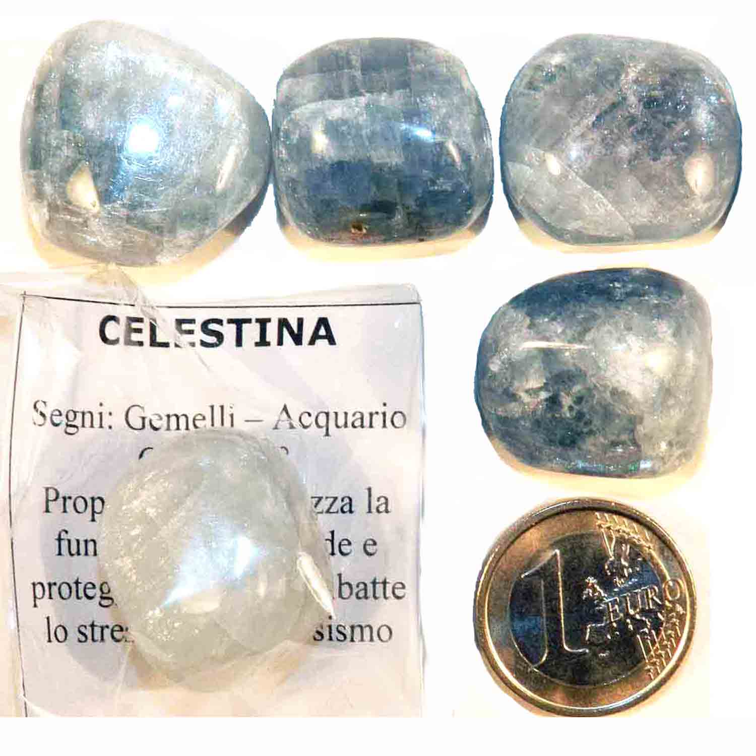 Celestina un Pezzo Large 20-27 gr - cm 2-2,5 Pietre Dure Burattate Minerali Lavorati Cristalloterapia, confezionato con piccola scheda descrittiva, come in foto.