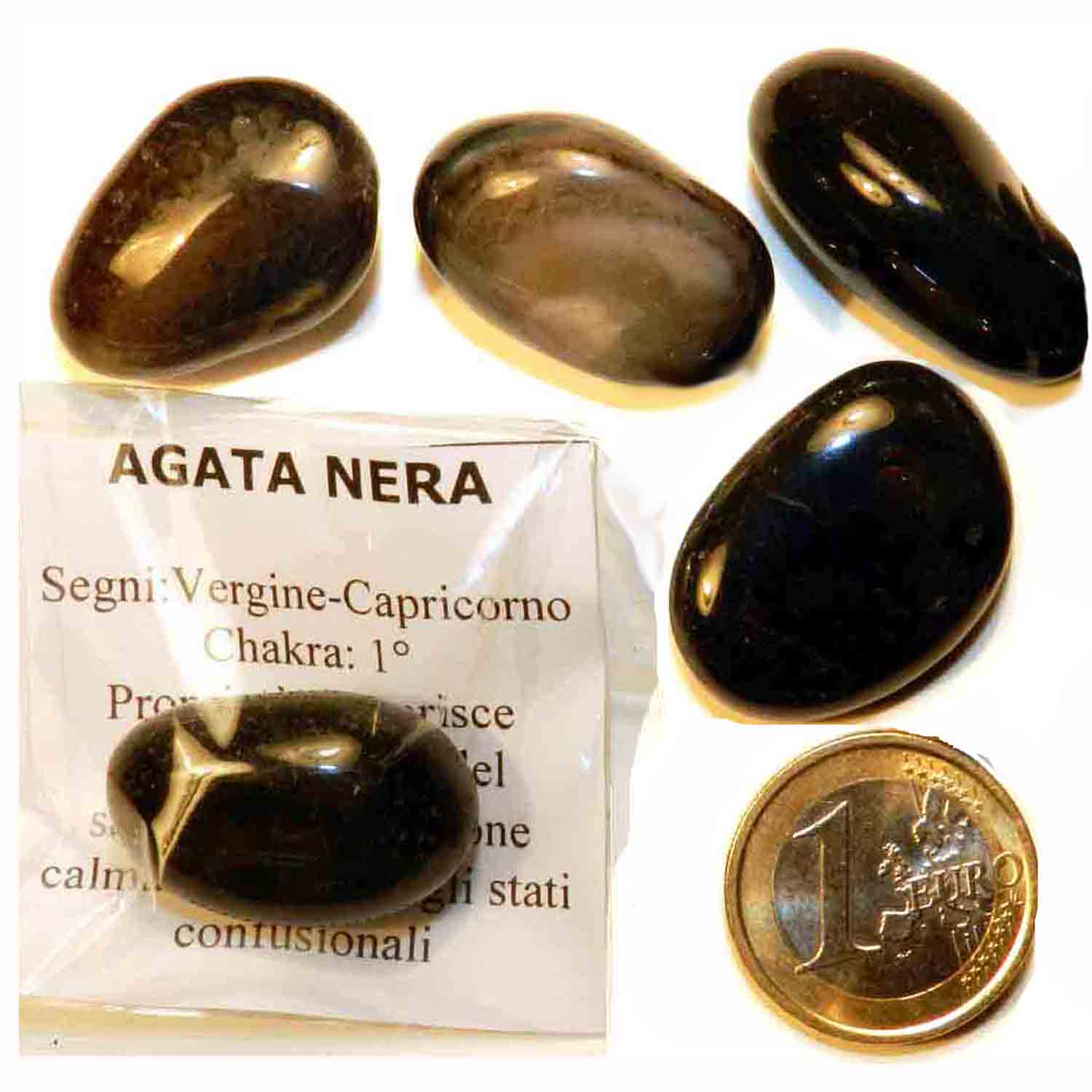 Black Agate one Piece 9-11 gr - cm 2.5-3 Tumbled Stones Worked Minerals Crystaltherapy, packaged with a small description card (Italian language), as in the photo.