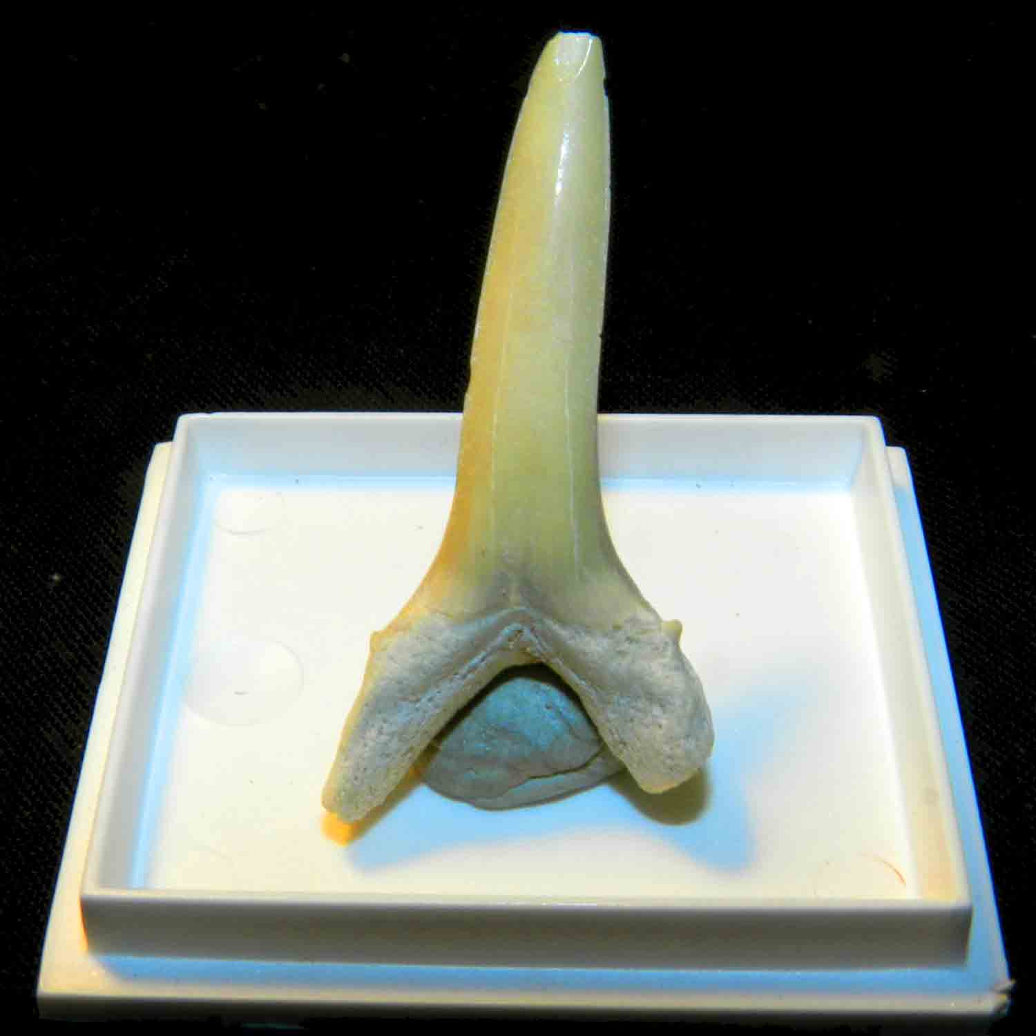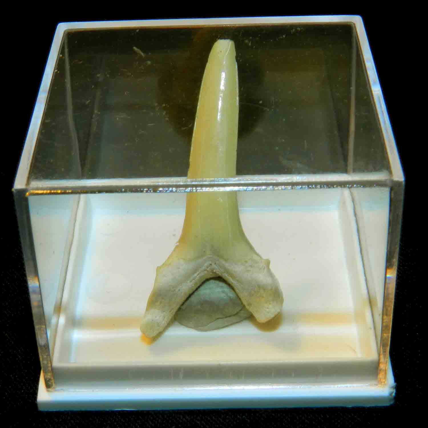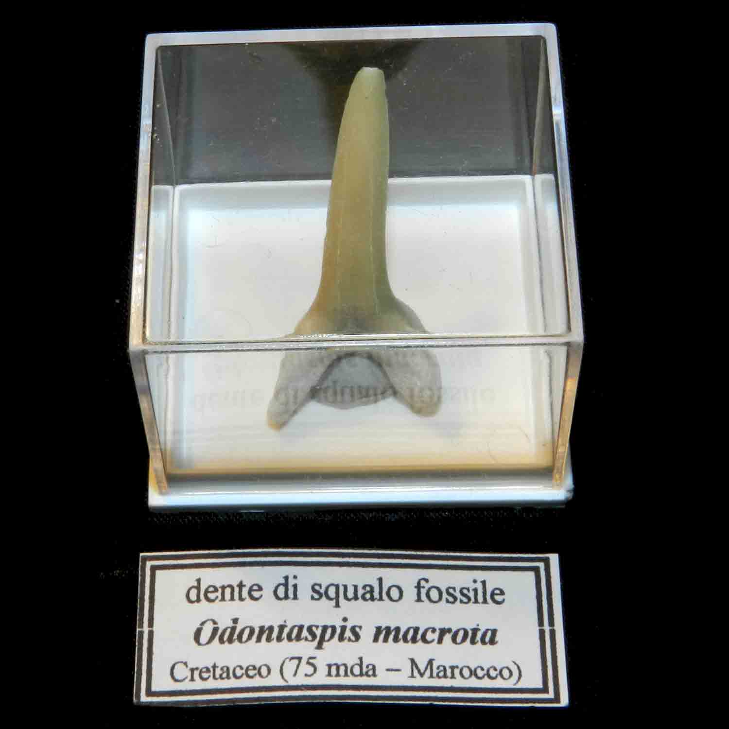 Dente di Squalo Fossile Odontaspis Striatolamia macrota cm 3,5 Pescecani Pesci Cartilaginei Condroitti Selaci Elasmobranchi Odontaspidi, fissato con plastilina in scatola plexiglas (mm 42 x 37 x 32), pezzo unico, come in foto.