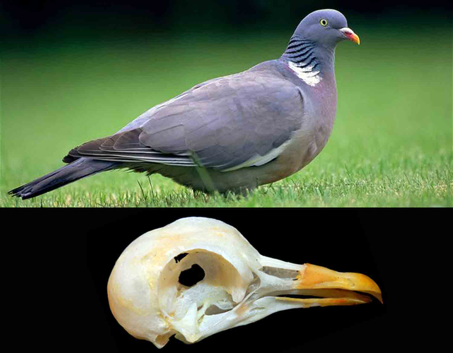 Woodpigeon Skull Columba palumbus cm 5.7 Aves Columbiformes Columbidae, complete of Mandible, only a piece, as in photos. Family: Columbidae (columbus, dove, pigeon). Common name: Common Woodpigeon. The wood pigeon (Columba palumbus Linnaeus, 1758) is a species of bird in the Columbidae family (Columbidae). It is the largest, most frequent and most widespread columbid species in Europe. The wood pigeon is 40 to 42 cm long and, therefore, substantially larger than the pigeon (Columba livia). Its wingspan reaches 80 cm and can weigh up to 570 grams. The sexes look alike. The living space of wood pigeons is forests of all types, especially edge forests, but also gardens and city parks. They are widespread in the Middle East and throughout Europe. The flight is fast and agile, allowing the wood pigeon to change direction without hesitation and to escape suddenly if necessary. It moves in large flocks in search of food. Wood pigeons feed on seeds, berries, apples, roots and sometimes small invertebrates. In autumn and winter they mainly eat the fruits of beech trees and the acorns of oak trees. The nest is made only of straw and branches and is mostly built high up in the trees. They lay 1 or 2 eggs once or twice a year. The young are fed mainly with mash, commonly called pigeon milk, which the parents regurgitate from the beak. The young abandon the nest after about 3-5 weeks. The wood pigeon is not much loved by farmers, as large flocks sometimes fall on crops causing great damage. He has adapted well to cities, so much so that he is a frequent visitor to parks, even if he is much shyer than a pigeon; its main habitat, however, remains the countryside, where it is very present. It is hunted and highly sought after for the flavor of its meat.